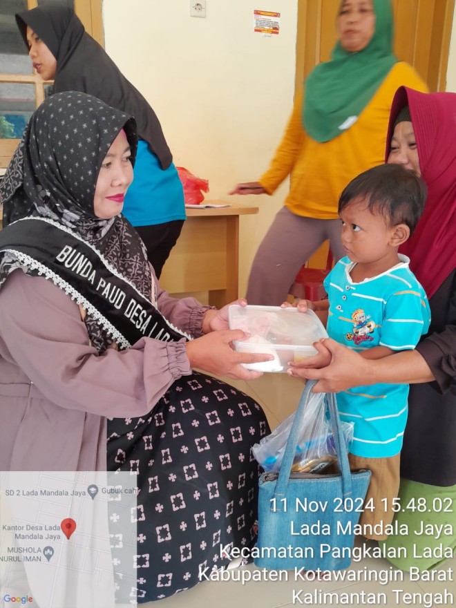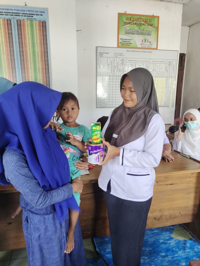 Pengukuran berat badan, lingkar lengan dan lingkar kepala, serta pemberian Makanan Tambahan bagi anak Stunting dan Stunted di Desa Lada Mandala Jaya.